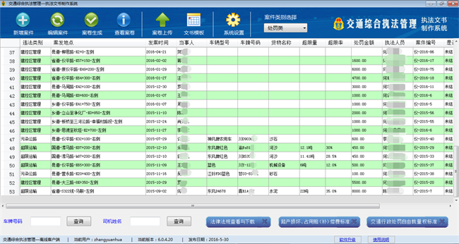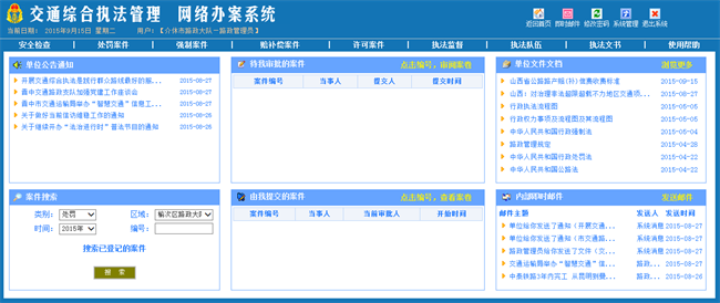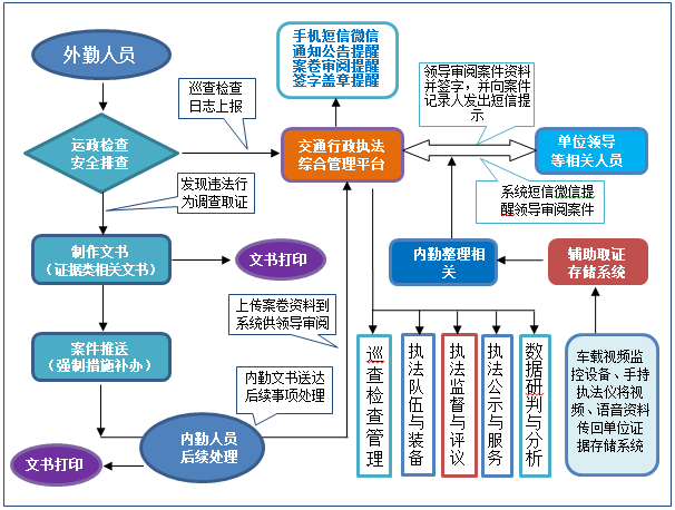 在全市建设统一、规范的交通综合执法文书制作系统、网络办案系统,为交通执法部门的案件处理提供标准的处理程序以及为执法单位的公文处理提供极大的方便;集中存放和管理全县交通行政执法案件;为外勤执法人员远程提供案件相关信息;向公众全面公开各类交通执法信息和数据,提高行政执法工作的透明度。将市县级执法单位、基层执法单位的日常工作纳入到交通综合执法系统体系中,外勤人员通过系统提供的信息开展远程执法检查工作,内勤人员通过系统完成行政处罚流程。