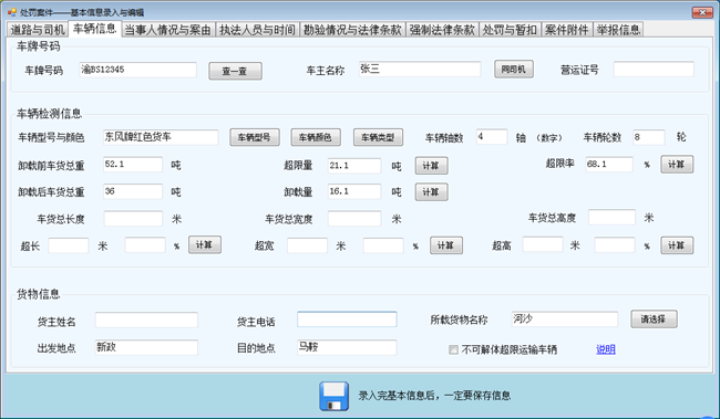 车辆基本信息界面:车辆型号和颜色可以手工选择,超限量、超限率可以自动计算,系统同时可以设置超限率与超限量是否可以自主修改。