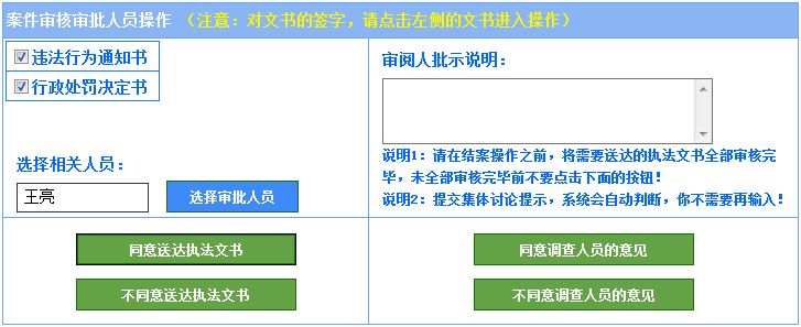 执法文书送达审阅审批操作:(主要是指:违法行为通知书、行政处罚决定书、限期拆除通知书、限期拆除决定书、强制措施决定书等 的审阅)