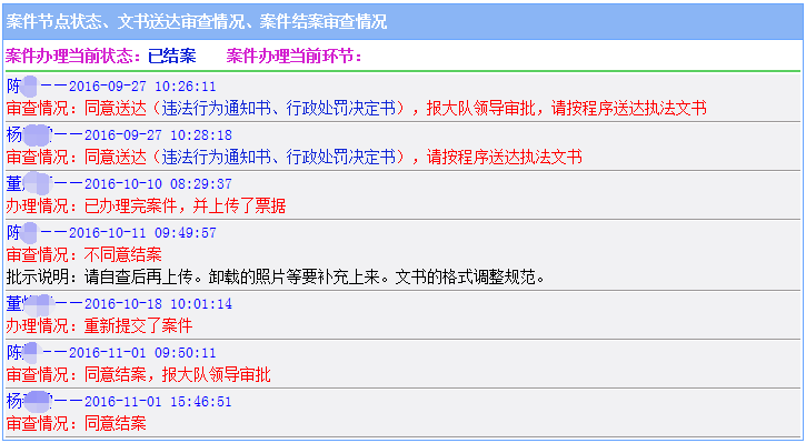 当:执法人员在客户端制作好案卷后,然后上传到网站,会立即通知其其单位的法制部门负责人审阅,法制部门负责人审阅后,可以驳回、也可以进一步提交给单位分管领导审阅。分管领导审阅后,可以提交给盖章人员,也可以驳回给法制部门负责人。然后又是下一个文书的审阅。
