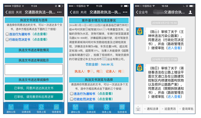 经过我方技术人员多次测试以及和交通路政单位一线执法人员的实践与沟通,一致认为本系统适合采用:客户端+Web+APP+微信企业号的多重模式操作,即使是没有网络的偏远地区也能现场制作执法文书。